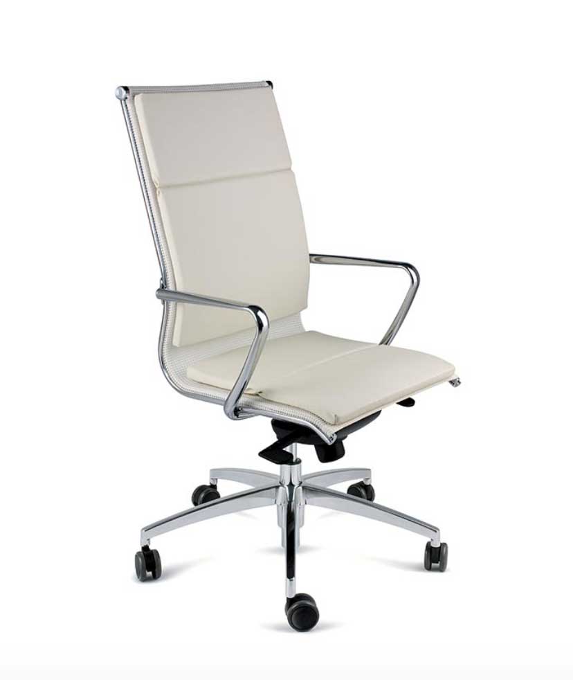 Alia Moving / Fauteuil de direction en cuir dossier haut Le fauteuil de direction Alia présente un design sobre et épuré tout en élégance. Doté d´une structure en acier chromé trà¨s esthétique, le sià¨ge de direction Alia est muni d´une assise en cuir naturel offrant un grand confort d´utilisation tout au long de la journée. Fabriqué par la marque italienne Moving, reconnu pour la qualité de finition de ses fauteuils de bureau design, le fauteuil de direction en cuir Alia est équipé d´un mécanisme basculant tilt permettant un blocage de l´assise dans 5 positions. Réglable en hauteur, ce sià¨ge de direction est également doté d´accoudoirs fixes trà¨s esthétiques et d´un pià¨tement en aluminium poli trà¨s raffiné. Le sià¨ge de direction en cuir Alia est disponible en plusieurs couleurs et sera du meilleur effet dans un bureau de direction ou un cabinet.