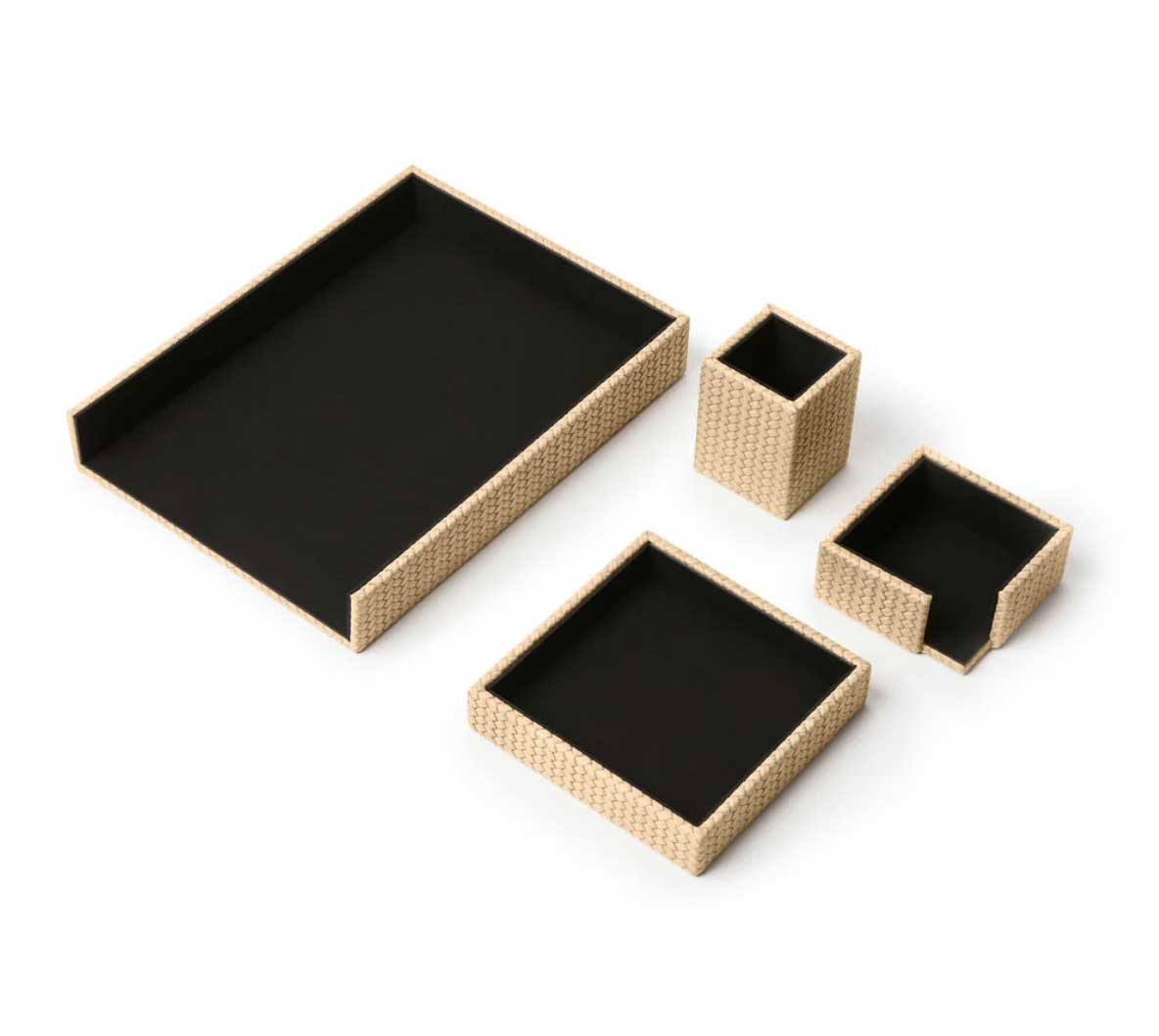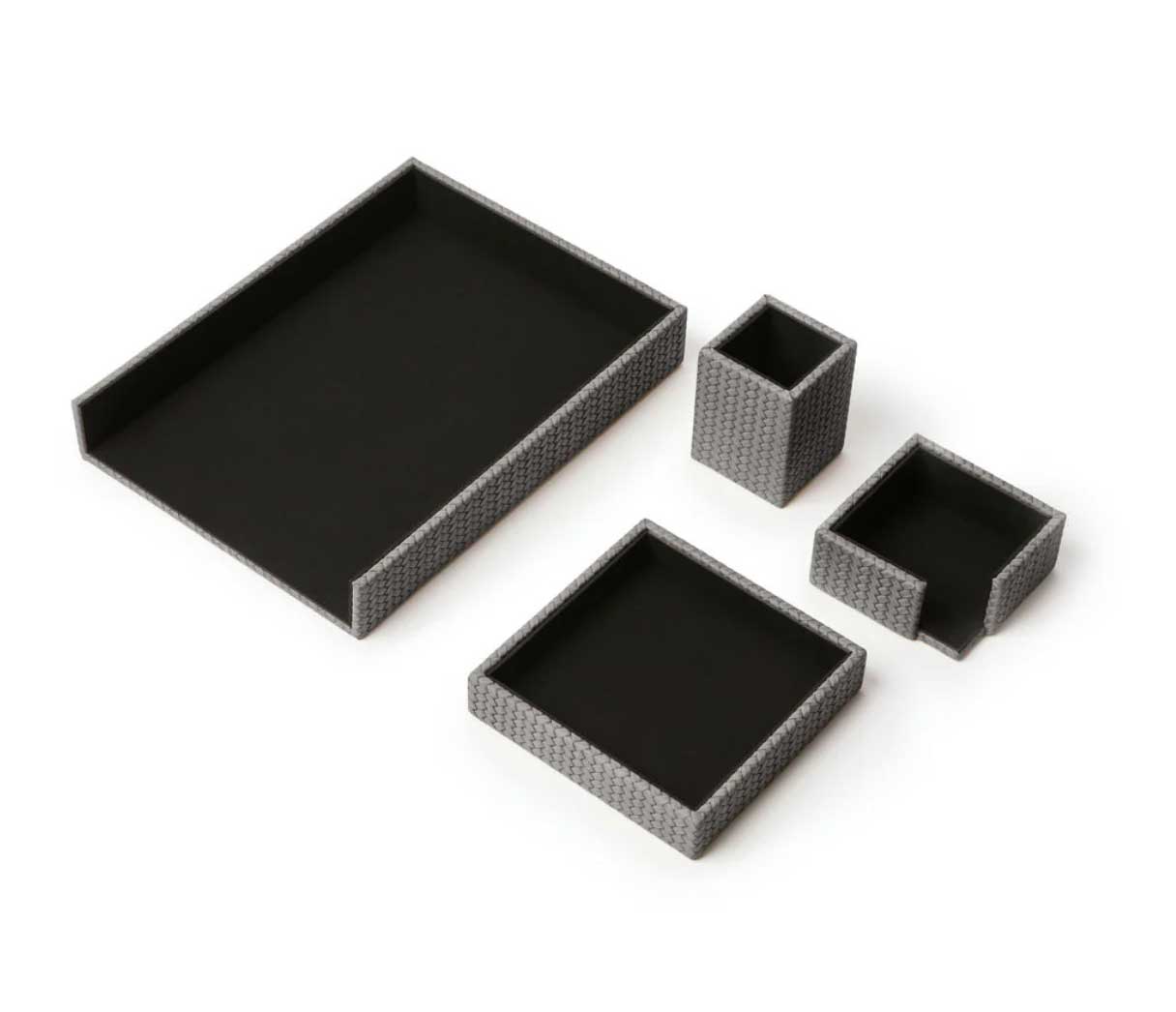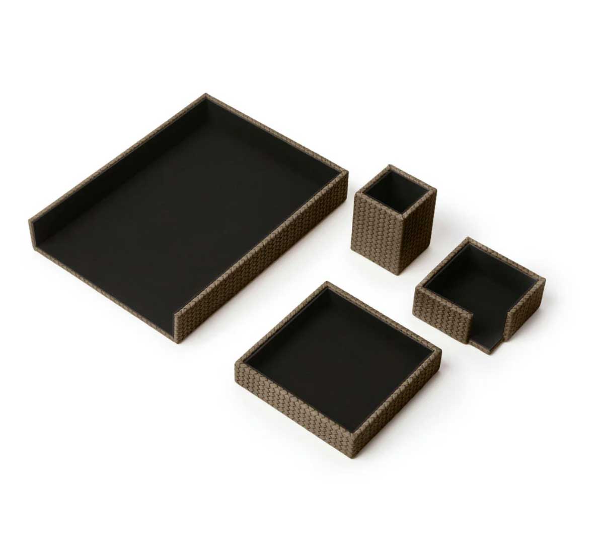 Cette combinaison de matériaux confà¨re au set Giove une allure luxueuse tout en assurant une durabilité adaptée aux usages quotidiens. Le Savoir-Faire Italien au Service de Votre Bureau Chaque pià¨ce de la parure Giove est entià¨rement fabriquée à la main en Italie par des artisans expérimentés. Chaque étape de fabrication, de la découpe des matériaux à l´assemblage final, est réalisée avec une précision et un soin minutieux. Le résultat est un ensemble qui reflà¨te le meilleur de l´artisanat italien, alliant esthétisme et qualité irréprochable. Une Organisation à‰légante et Personnalisable Grà¢ce à son design intemporel et ses matériaux nobles, la parure de bureau Giove s´intà¨gre parfaitement à tout style de décoration intérieure, qu´il soit moderne ou classique. Pour compléter ce set, Eglooh propose une gamme d´accessoires assortis, comme des sous-mains et des tapis de souris, afin de créer un espace de travail harmonieux et fonctionnel. Optimisez Votre Espace de Travail avec Giove La parure de bureau en cuir véritable Giove n´est pas seulement un ensemble d´accessoires, mais une véritable déclaration de style et de raffinement. Que ce soit pour un usage personnel ou professionnel, elle transforme votre bureau en un espace organisé et prestigieux, o๠chaque détail compte. Offrez à votre espace de travail le luxe et la qualité d´une création Eglooh, et découvrez une nouvelle manià¨re de travailler avec élégance et efficacité.
