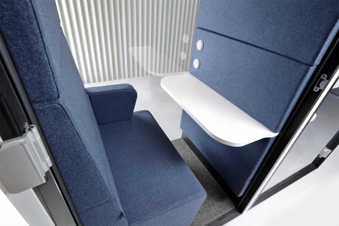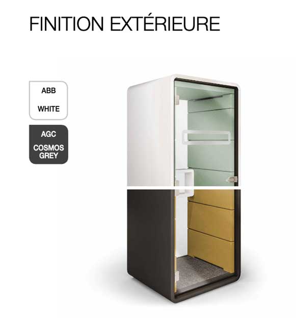 La cabine réduit le bruit venant de l'extérieur de la cabine (de 70 dB à 36 dB) ainsi que le bruit venant de l'intérieur de la cabine (de 60 dB à 26 dB). Porte anti-collision, module d'alimentation (1 x prise de courant 230V, 1 x USB type A, 1 x RJ45) x 2.