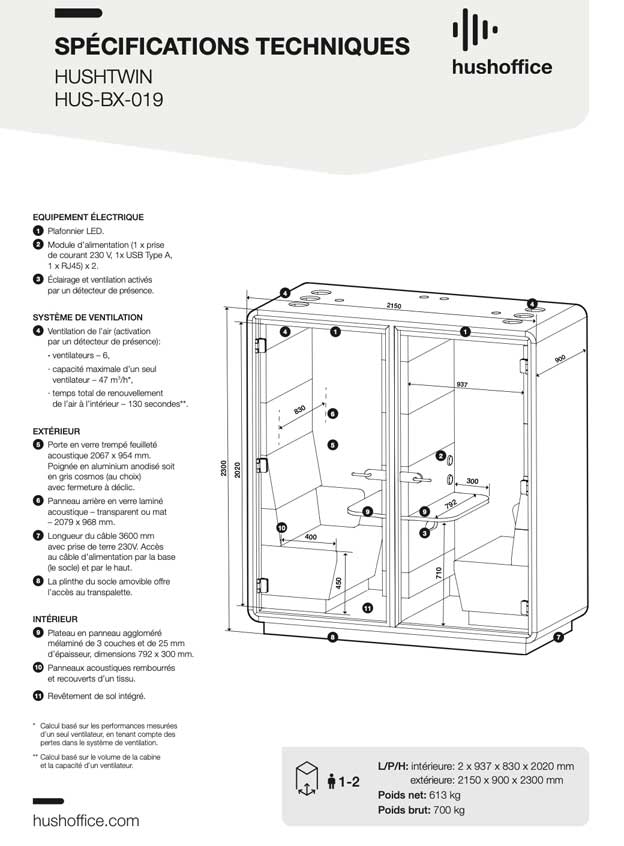 L´open-space est dorénavant choisi par la plupart des entreprises. La cabine HushTwin assure la confidentialité de certains échanges ainsi que l´isolement possible des collaborateurs en cas de nécessité de concentration. Dotée de deux emplacements identiques, elles profitent d´un renforcement d´isolation intérieure particulià¨rement efficace. La cabine acoustique HushTwin de la gamme Hushoffice vous garantit le confort de travail particulià¨rement ergonomique de sa banquette. Vous pourrez également connecter votre ordinateur portable à une prise électrique, une prise USB ainsi une prise RJ45 installées dans chaque cabine de votre caisson acoustique HushTwin. Entià¨rement mobile, la cabine acoustique HushTwin a été pensée pour àªtre facilement installée dans votre espace de travail partagé ou déplacée dans votre open-space grà¢ce à la présence d´un espace sous le plancher principal permettant d´y glisser une fourche de transpalette. Avec une occupation au sol de moins de deux mà¨tres carrés, la cabine acoustique double HushTwin est entià¨rement configurable et peut rejoindre la plupart des espaces partagés.