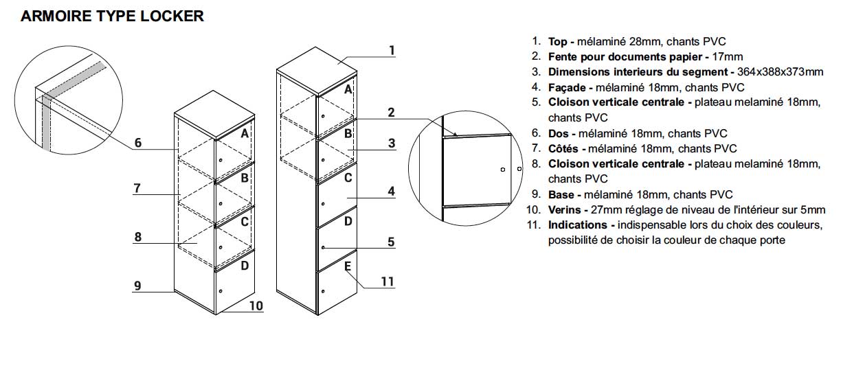 Vérins: 27mm de réglage de niveau de l'intérieur sur 4mm, chaque porte est équipée d'une serrure avec clé, Possibilité de choisir la couleur pour chaque porte: Lors de votre commande Indiquer dans la zone de commentaires de votre commande les coloris des portes numérotées de A à E en partant du haut.