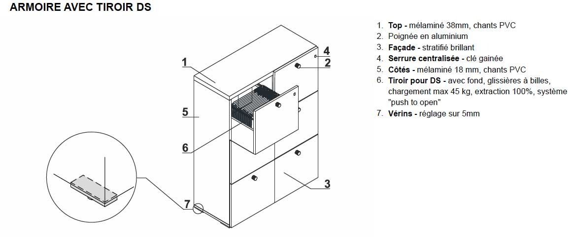 Serrure centralisée, clé gainée, Tiroir pour dossiers suspendus avec fond, glissières à billes, chargement 45 kg max, extraction 100%, système push to open, vérins avec réglage sur 5 mm