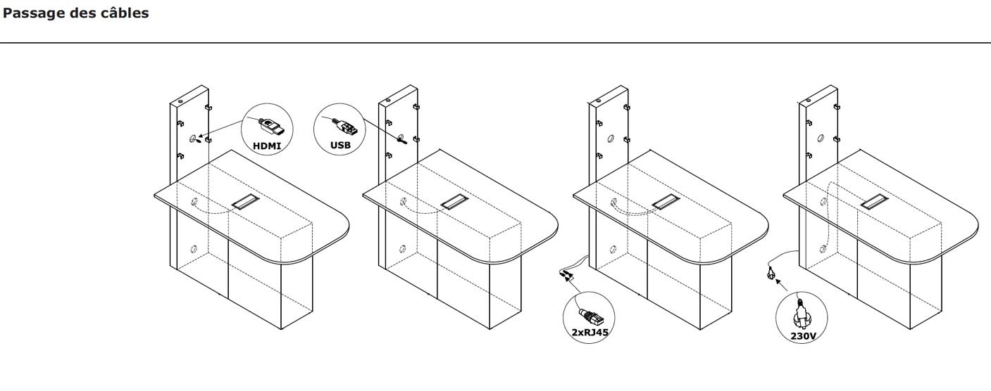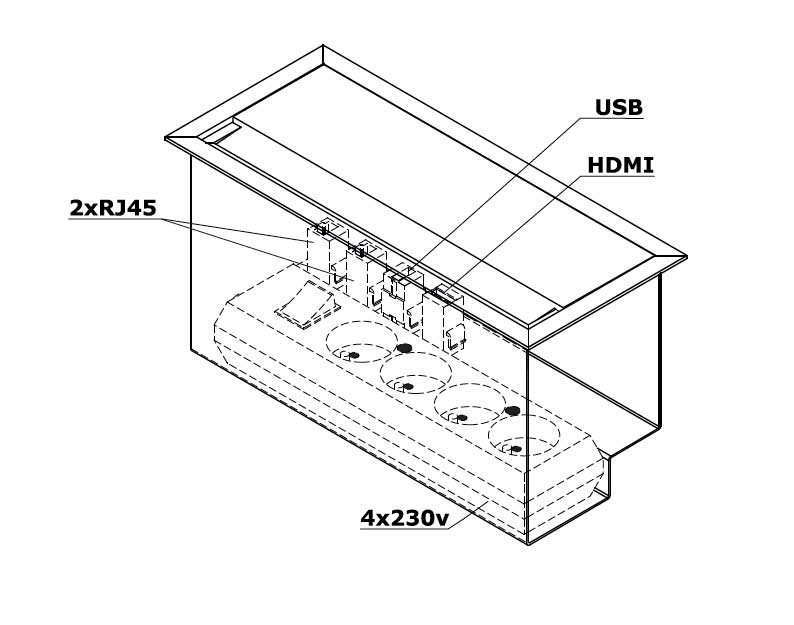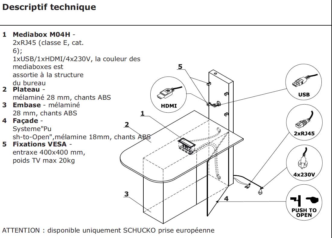 Plateau de travail équipé d'une média box avec les prises suivantes: 2 x RJ45 (classe E, Catégorie 6), 1 x USB, 1x HDMI, 4 x 230V.