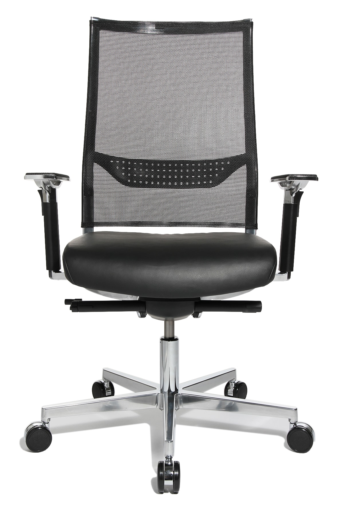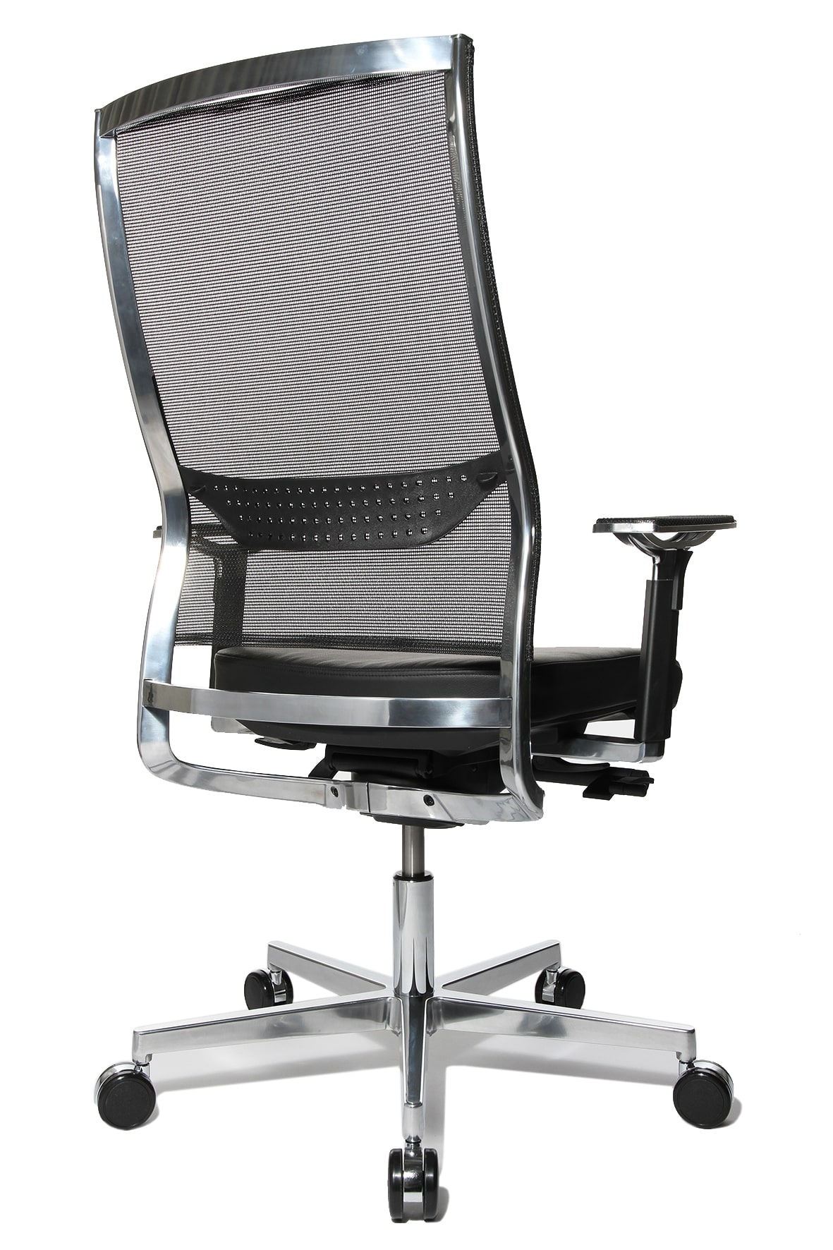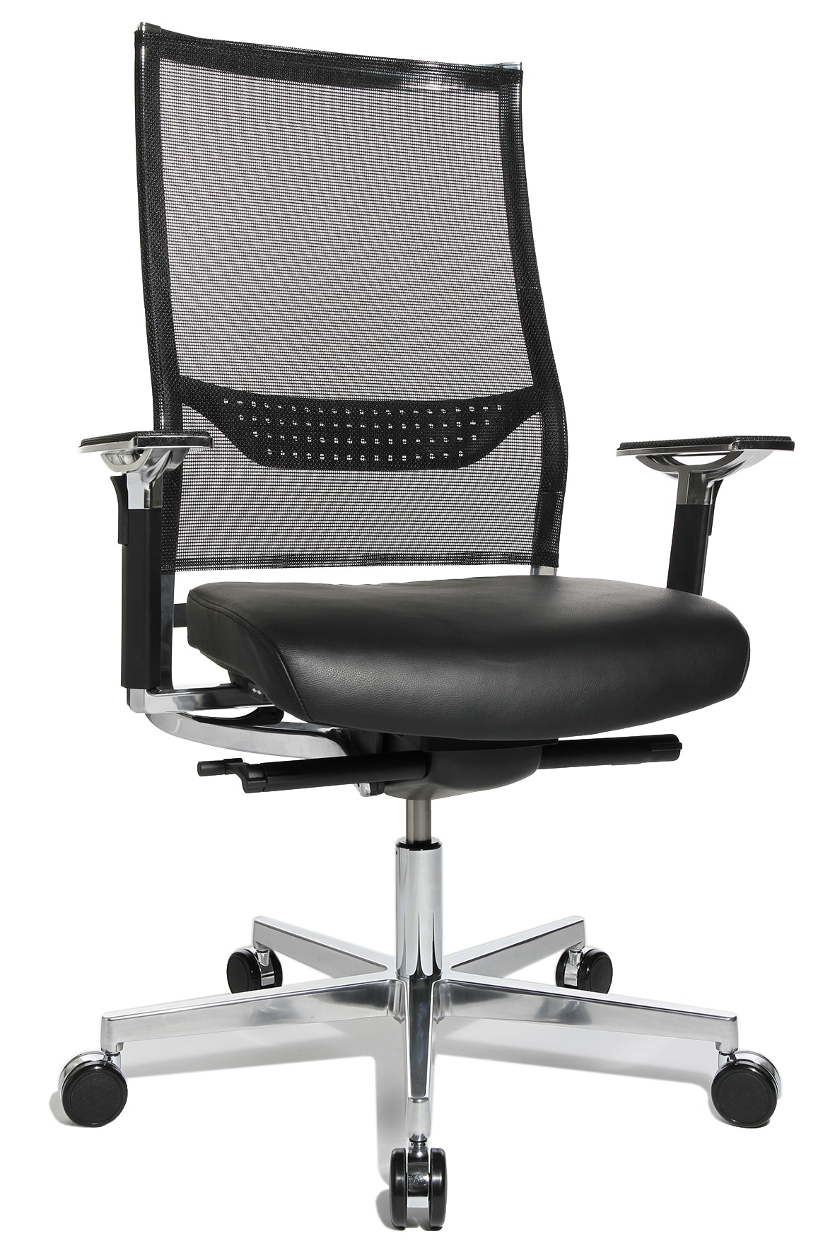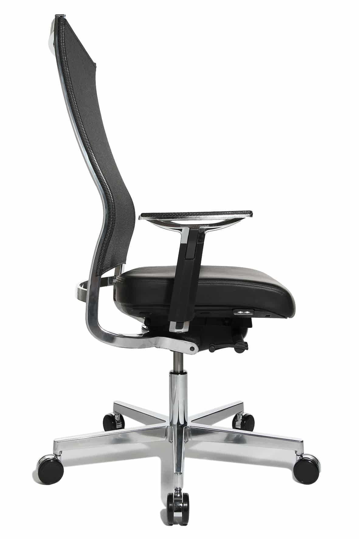 New Aluart Fauteuil de direction avec appuie-tàªte et dossier filet Le fauteuil de direction en cuir New Aluart conà§u par le designer Peter Wagner pour la marque allemande Topstar vous séduira par sa qualité et par son ergonomie. Le design particulià¨rement étudié de ce fauteuil de direction design en fait un compagnon précieux pour les longues heures de travail. Le fauteuil de direction avec appuie-tàªte New Aluart dispose d’un mécanisme synchrone et vous évite les maux de dos liés à la posture assise prolongée Grà¢ce à son dossier disposant d’un soutien lombaire intégré réglable en hauteur. Le dossier en filet thermoactif permet une meilleure respiration du dos afin d’éviter les phénomà¨nes de transpiration inconfortables. New Aluart est muni d’un systà¨me de réglage de la hauteur d’assise. Les accoudoirs de ce fauteuil de direction avec appuie-tàªte sont quant à eux également réglables en hauteur. Les matériaux utilisés pour ce sià¨ge design, cuir vachette pour l’assise et aluminium poli pour le pià¨tement, en font un sià¨ge de direction trà¨s esthétique et trà¨s qualitatif. Le fauteuil New Aluart est disponible en 2 versions noir ou blanc.