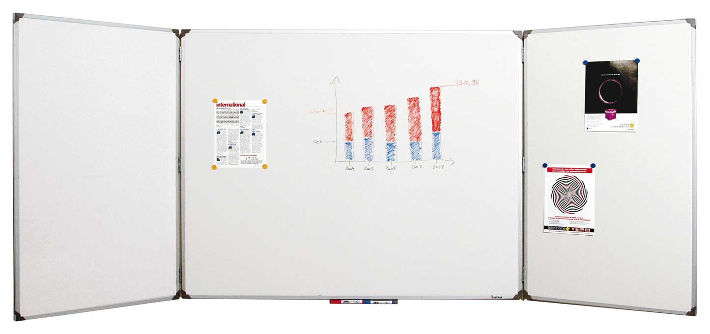 Office Triptyque tableau blanc émaillé Le triptyque blanc de la gamme Office est un ensemble de trois tableaux blancs conà§u par la marque franà§aise Planorga. Le triptyque blanc de la gamme Office dispose d’une surface d’écriture magnétique, effaà§able à sec et prévu pour un usage intensif. Le tableau blanc de la gamme Office vous donne la possibilité d’écrire sur cinq faces émaillées. Office dispose par ailleurs de deux volets qui se replient aisément sur le panneau central et vous permettront un gain de place et un meilleur confort de travail. Le tableau blanc de la gamme Office est aussi équipé d’un auget de 30cm qui vous permettra de garder vos feutres à portée de main. Le triptyque blanc de la gamme Office sera donc un excellent outil de travail pour vos réunions et présentations.