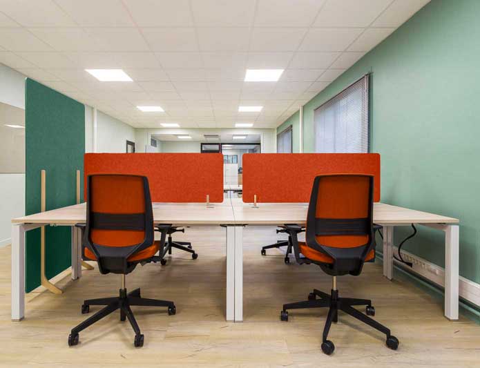 Ajoutez des totems Pylo ou des cloisons Idaho pour renforcer l’absorption acoustique et dynamiser l’esthétique de vos espaces.