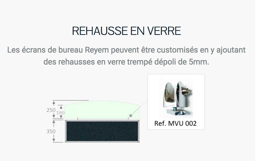 Cette réhausse en verre dépoli constitue l’extension idéale pour optimiser vos écrans de séparation Reyem existants. Conçue spécifiquement pour s’intégrer parfaitement au système modulaire Reyem, elle offre une solution évolutive pour l’aménagement des espaces de travail.