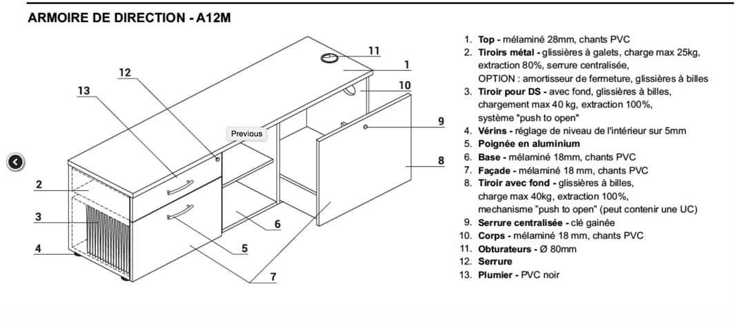 Top en mélaminé 28mm, chants PVC, Tiroirs métal: glissière à galets , charge max. 25kg, extraction 80% serrure centralisée, Tiroirs pour Dossier Suspendu avec fond, glissières à billes, chargement max. 40kg, extraction 100%, push to open, Vérins, réglage de niveau de l'intérieur sur 5mm, Poignée en aluminium, Base en mélaminé 18mm, chants PVC, Façade en mélaminé 18mm, chants PVC, Tiroirs avec fond, glissières à billes, charge max. 40kg, extraction 100%, mécanisme "push to open" (peut contenir une UC), Serrure centralisée , clé gainée, Corps en mélaminé 18mm, chants PVC, Obturateurs Ø 80mm, Serrure, Plumier PVC noir