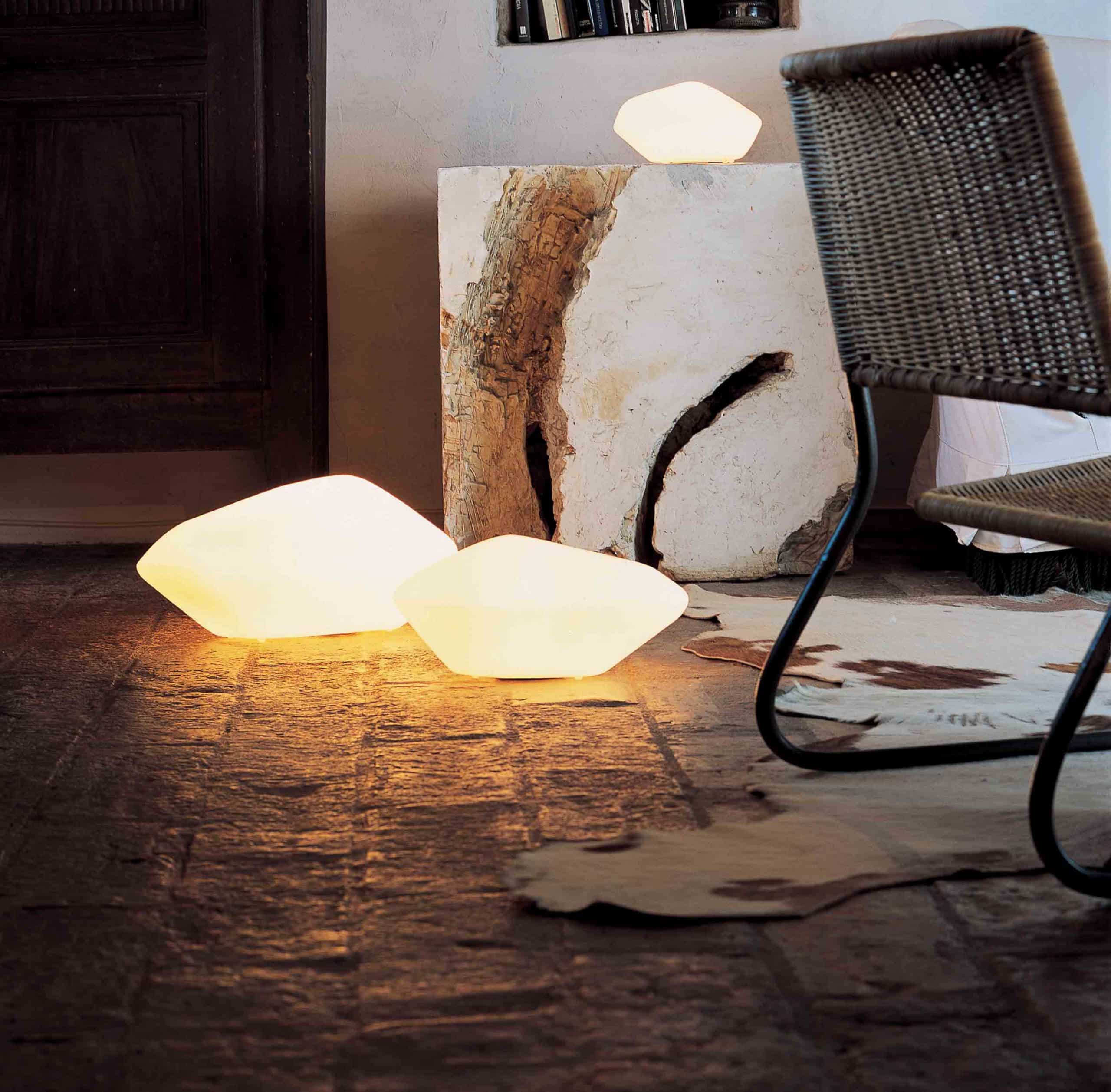 Stone of Glass Pierre lumineuse Véritable objet de décoration, la pierre lumineuse Stone of Glass s’inspire de la nature pour mettre en lumià¨re votre intérieur ! Créée en 2001 par le studio Laudani et Romanelli pour la marque italienne Oluce, la pierre lumineuse Stone of Glass est aussi design que fonctionnelle. Sur une structure en PBT, son diffuseur en verre soufflé de Murano illumine votre espace avec douceur pour une ambiance chaleureuse et rassurante. Disposée seule sur une table d’appoint ou une commode, la pierre lumineuse Stone of Glass ressemble à une sculpture reprenant les formes naturelles de la pierre pour un esprit cosy des plus agréable. Sur le coin d’un bureau, elle deviendra également un objet de décoration à part entià¨re et viendra personnaliser votre pià¨ce avec élégance. Le petit plus ? N’hésitez pas à disposer plusieurs pierres lumineuses Stone of Glass dans une màªme pià¨ce ! Leur design naturel et leur lumià¨re tamisée créeront une ambiance zen et relaxante idéale pour les moments de repos dans un salon ou un espace détente.