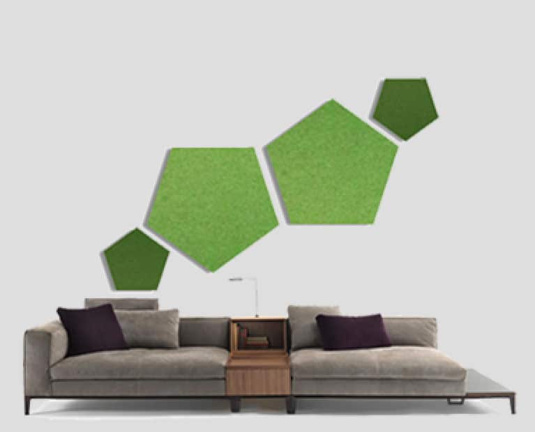 T-Frame / Panneau acoustique mural Pentagone Le panneau acoustique T-Frame composé de structure de fibres polyester multicouche raidie et de Tissu Ecofelt (90% Laine, 10% polyester) permet de réduire efficacement la propagation des ondes sonores dans votre pià¨ce. Elément décoratif décliné sous de nombreuses formes et couleurs, le panneau acoustique mural T-Frame vous permettra de personnaliser votre décoration tout en améliorant l´acoustique de vos locaux. Fabriqué par la marque italienne Slalom, réputée pour ses solutions acoustiques créatives et efficaces, le panneau acoustique T-Frame peut s´intégrer dans n´importe quel espace de vie tel qu´une salle d´attente, un bureau, une salle de réunion un espace détente ou une cafétéria. Le panneau insonorisant T-Frame de Slalom est recyclable à 100%