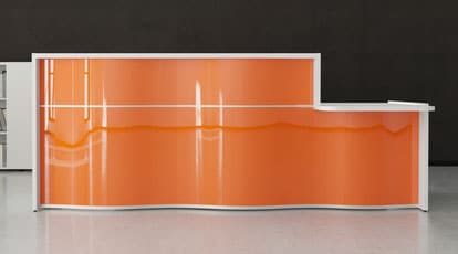 Wave Banque d’accueil avec PMR L297 cm Orange Les banques d’accueil Wave de la marque Mdd se distinguent par leur design tout en courbe et par leur sobriété des formes. Réalisée en mélaminé de qualité pour le corps de la banque et du plan de travail, la banque d’accueil Wave dispose d’une trà¨s jolie faà§ade en stratifié brillant qui accroche la lumià¨re et apporte à votre pià¨ce une touche de modernité. Les banques d’accueil Wave de forme droite sont tout particulià¨rement appréciables pour leur profondeur réduite qui permet d’optimiser l’espace de votre accueil. Les banques d’accueil Wave disposent d’un top en verre Lacobel trà¨s esthétique. Disponibles dans de nombreuses configurations et plusieurs couleurs attractives les banques d’accueil Wave de Mdd sont idéales pour aménager vos locaux et accueillir vos clients, patients et collaborateurs dans les meilleures conditions.